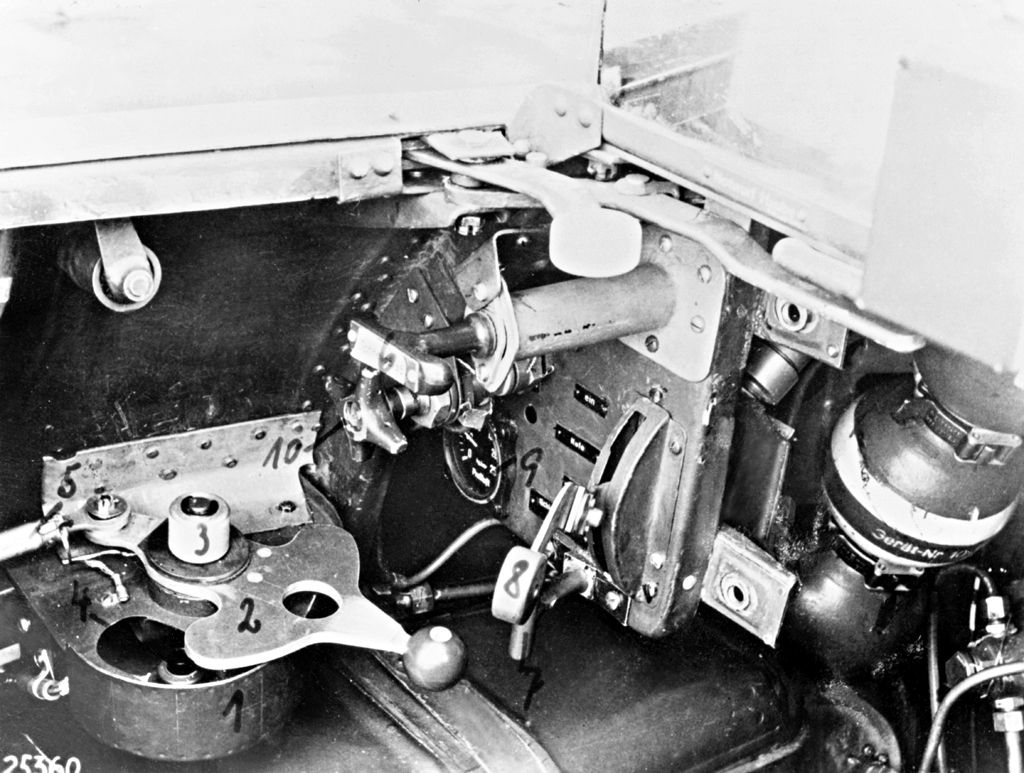 Erstaunlich ist die Tatsache, dass auf der frühen Zeichnung, von hinten eingesetzte Einschlag- oder Einsatzmuttern oder Annietmuttern für Holz zu erkennen sind, um die Geräte ein zuschrauben ! Hingegen die beiden Schubanzeigen auf der rechten Seite von hinten eingebaut wurden und von daher die Einschlag- oder Einsatzmuttern entfallen. Im laufe der Zeit ist diese Praxis dann in den späteren Baumustern entfallen.