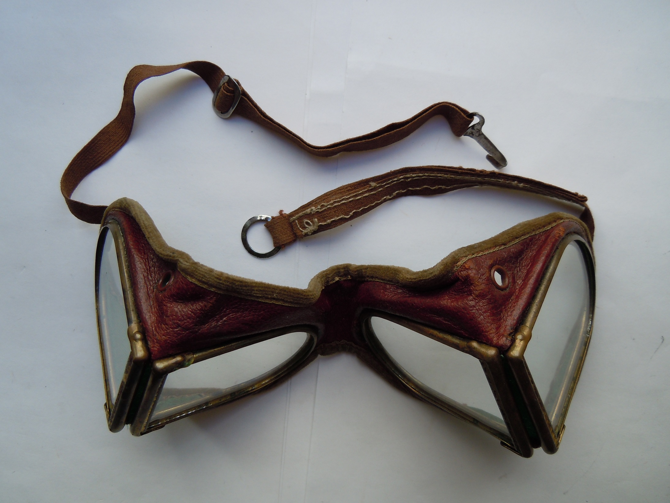 Falt-Windschutzbrille, 1917 Bezeichnung: Flieger-Windschutzbrille Baujahr: ca. 1917 Verwendung: bei der fliegenden Truppe Besonderheiten: Falt-Windschutzbrille, im originalen Etui aus Lederersatzmaterial