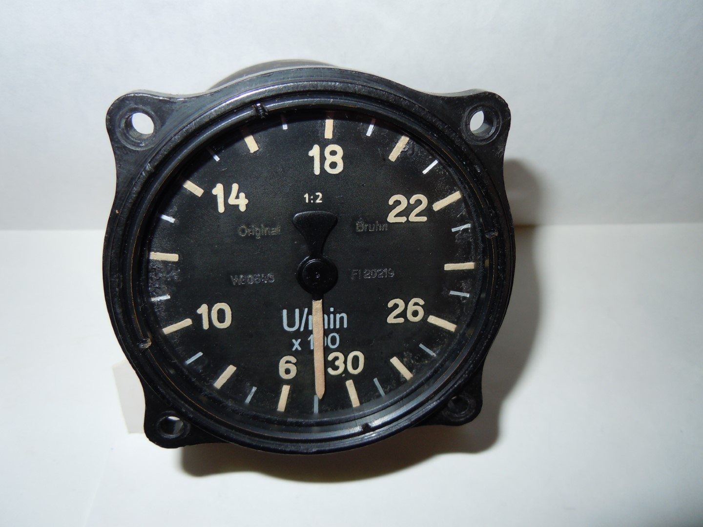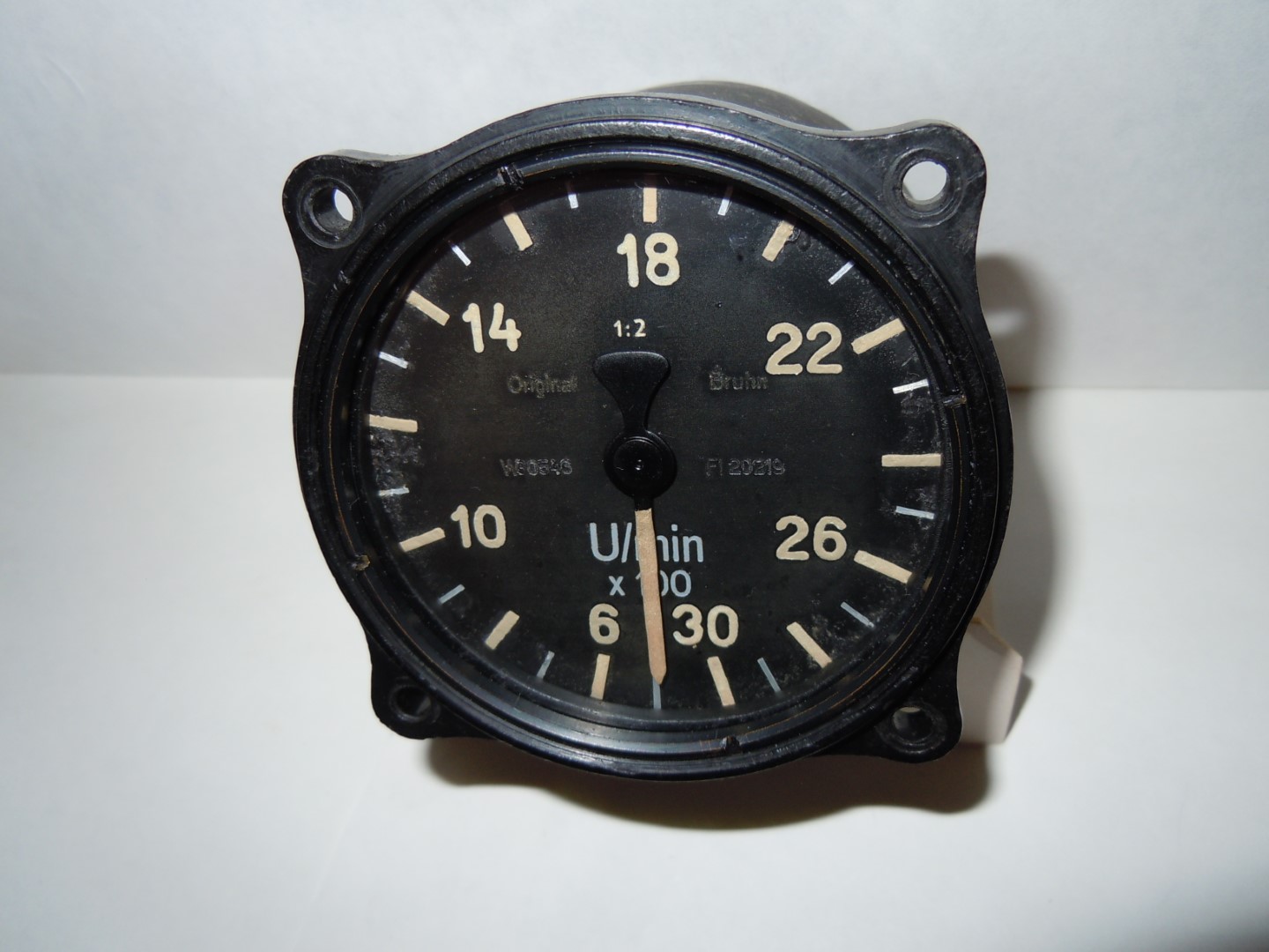 Fl.20219 Drehzahlmesser, 1936 Bezeichnung: mechan. Drehzahlmesser Anforderungszeichen: Fl. 20219 Baumuster: Retax Meßbereich: 600-3000 U/min Hersteller : Original-Bruhn, Berlin Baujahr: 1936 Flugzeugbaumuster: z.B. Bücker Bü 133 Funktionsweise