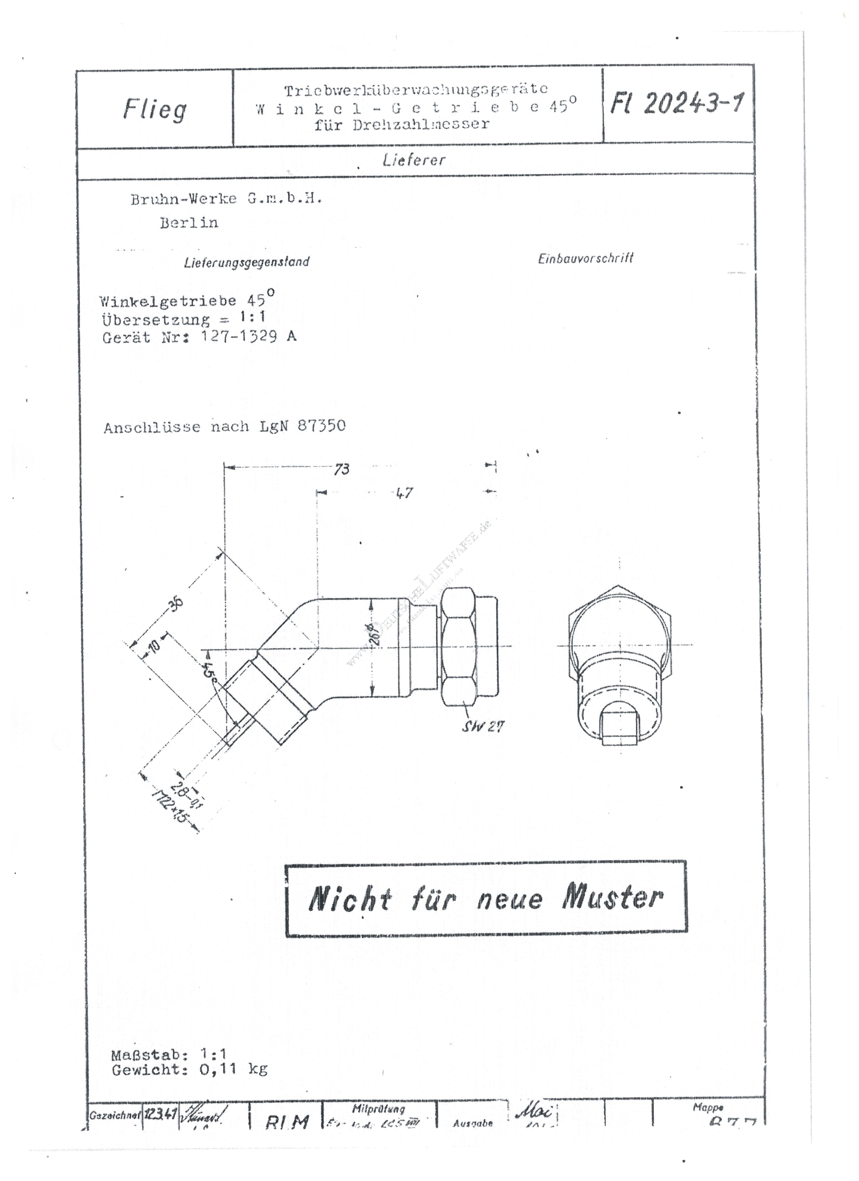Fl.20243-0 / Fl.20243-1 Winkel-Getriebe 45° Bezeichnung: WinkelGetrieb 45° Anforderungszeichen: Fl.20243-0 / Fl.20243-1 Gerät-Nr.: 127-1329 A Übersetzung: 1:1 Hersteller: Bruhn-Werke, Berlin Verwendung: für biegsame Wellen von z.B. Drehzahlmessern, Stellungsanzeiger etc.