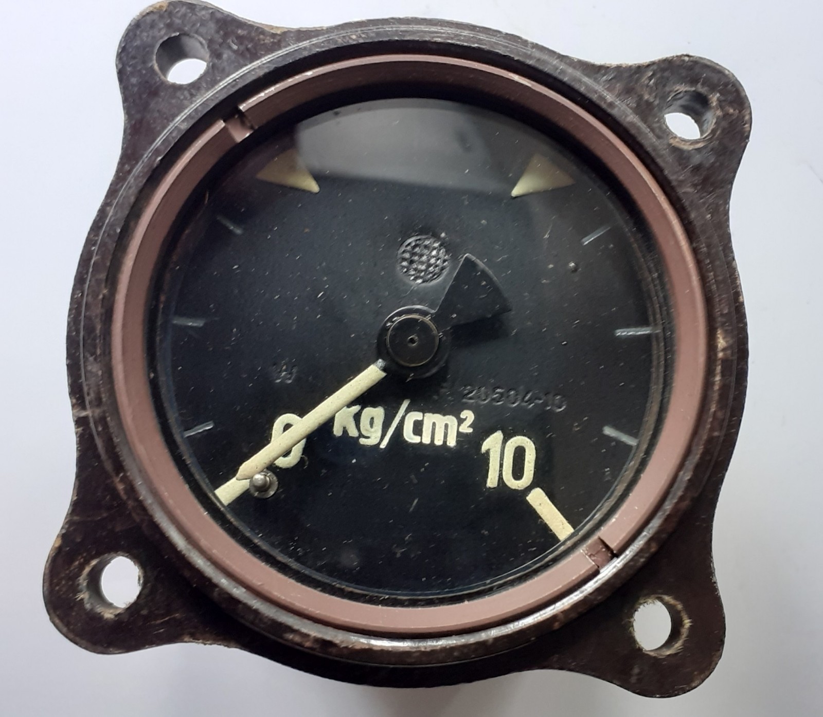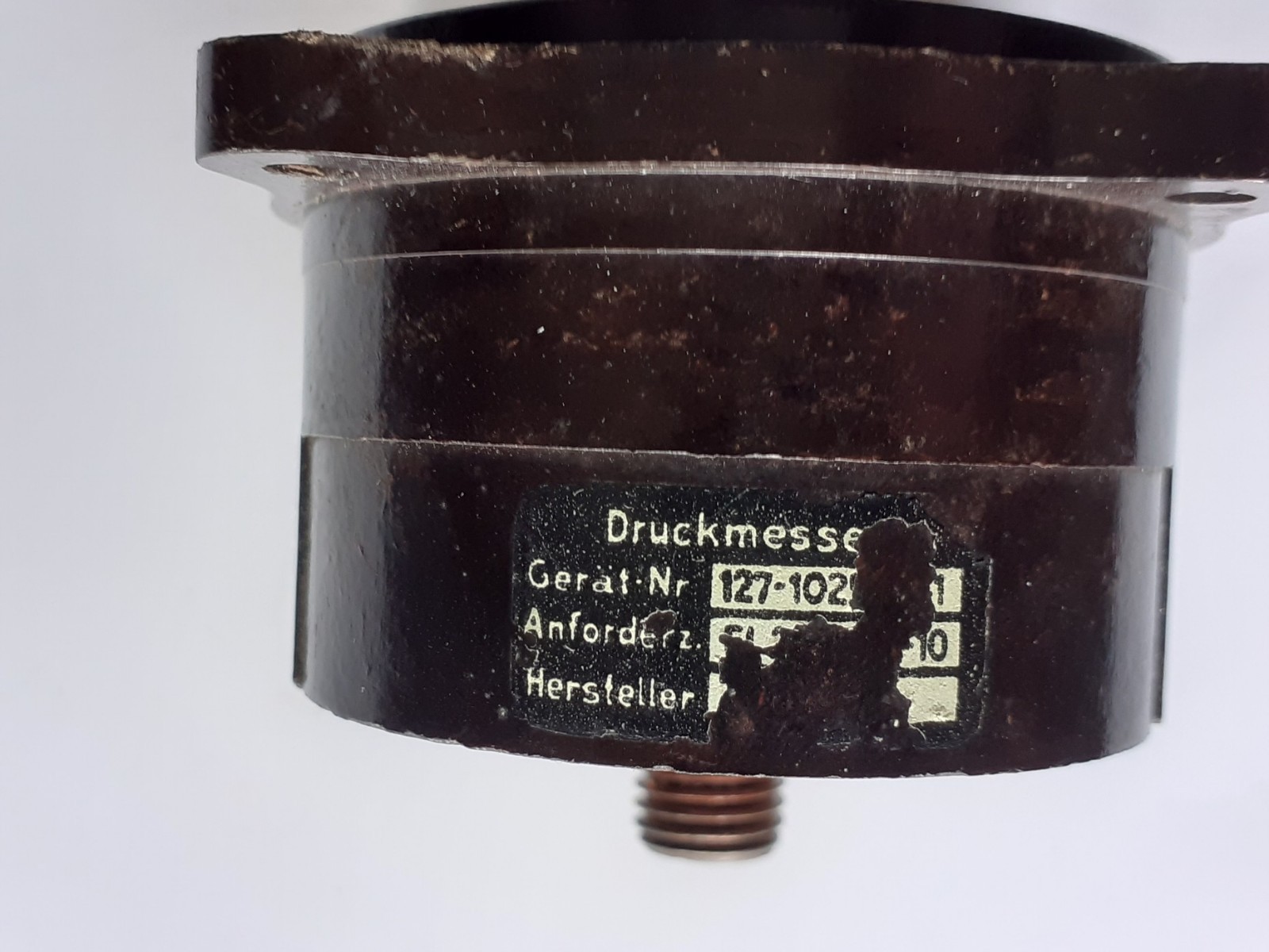 Fl.20504-10 Druckmesser 1944 Bezeichnung: Druckmesser Anforderungszeichen: Fl. 20504-10 Meßbereich: 0-10 kg/cm² Hersteller: Maximall Apparate Fabrik, Paul Willmann, Berlin Baujahr: ca. 1944 Verwendung: Druckmessung im Schmierstoffsystem des Motors Funktionsweise