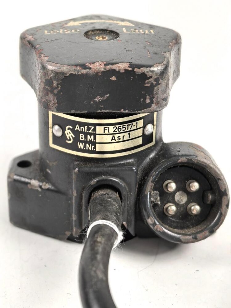 Fl.26571-1 Anschlussdose Asr 1 Bezeichnung: Anschlussdose Anforderungszeichen: Fl.26571-1 Baumuster: Asr 1 Hersteller: Siemens, Berlin Baujahr: ca. 1940 Bemerkung: mit Steckdose der Brechkupplung Fl.27561