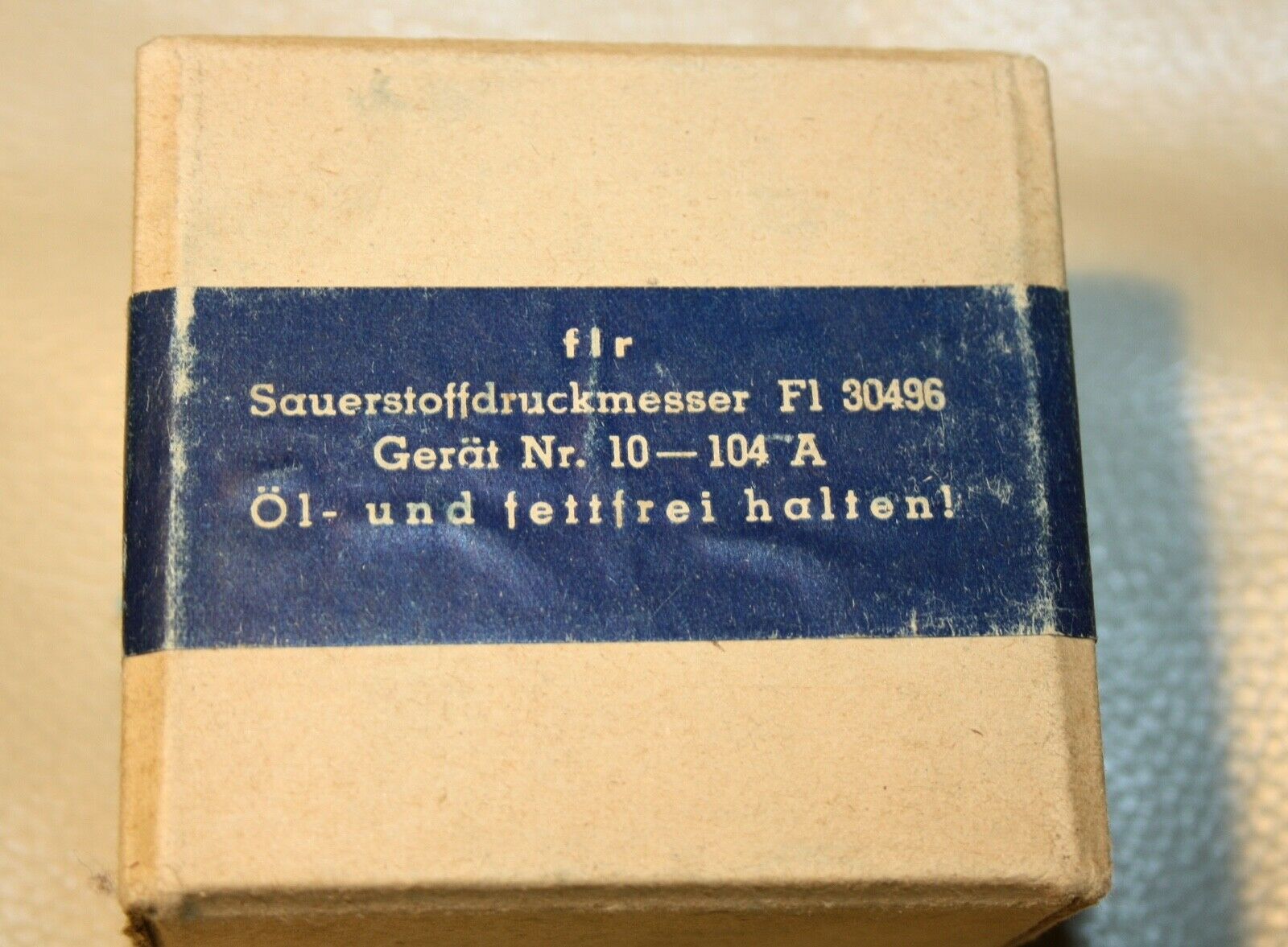 Fl.30496 Sauerstoffdruckmesser, flr, 1944 Bezeichnung: Sauerstoffdruckmesser Anforderungszeichen: Fl.30496 Gerät-Nr.: 10-104 A-1 Messbereich: 0 – 250 kg/cm² Hersteller: flr = Dräger Gesellschaft mbH, Wien Baujahr: ca. 1944 Bemerkung: im Originalkarton