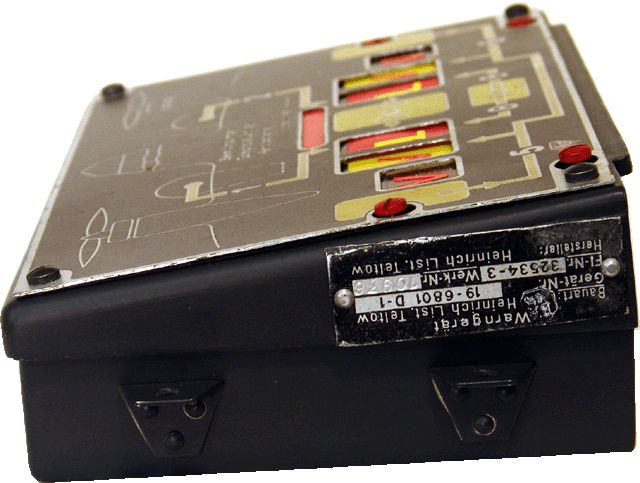 Fl.32534-3 Warngerät für Behälterschaltung Ju 88 Bezeichnung: Warngerät für Behälterschaltung Anforderungszeichen: Fl.32534-3 Gerät-Nr.: 19-6801 D-1 Hersteller: Elektro-Mechanik, Heinrich List, Teltow Baujahr: ca. 1942 Eingebaut in: Junkers Ju 88