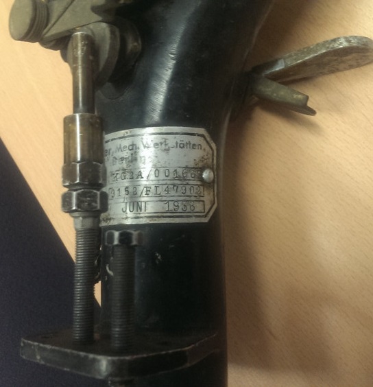Fl.47902 Steuerknüppel mit Knüppelgriff KG 2A, 1936 Bezeichnung: Steuerknüppel mit Knüppelgriff KG 2A Anforderungszeichen: Fl.47902 Baumuster: KG 2A Hersteller: L.Heber, Mechanische Werkstätten, Berlin Baujahr: 1936 Eingebaut in: z.B. Junkers Ju 87A