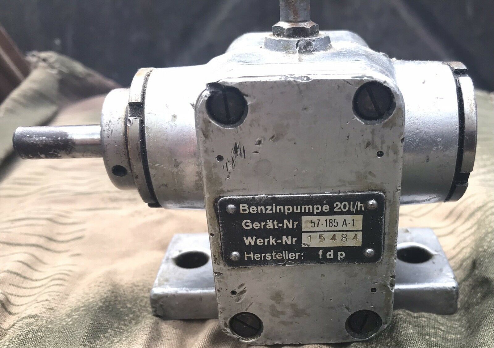 Fl.XXX Benzinpumpe, 57-185 A Bezeichnung: Benzinpumpe Anforderungszeichen: Fl.XXX Gerät-Nr.: 57-185 A Förderbereich: 20 l/h Hersteller: fdp = Barmer Maschinenfabrik A.G., Remmscheid-Lennep Baujahr: ca. 1944