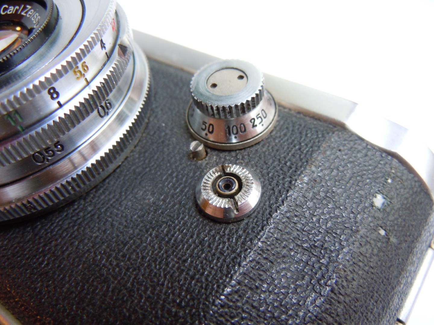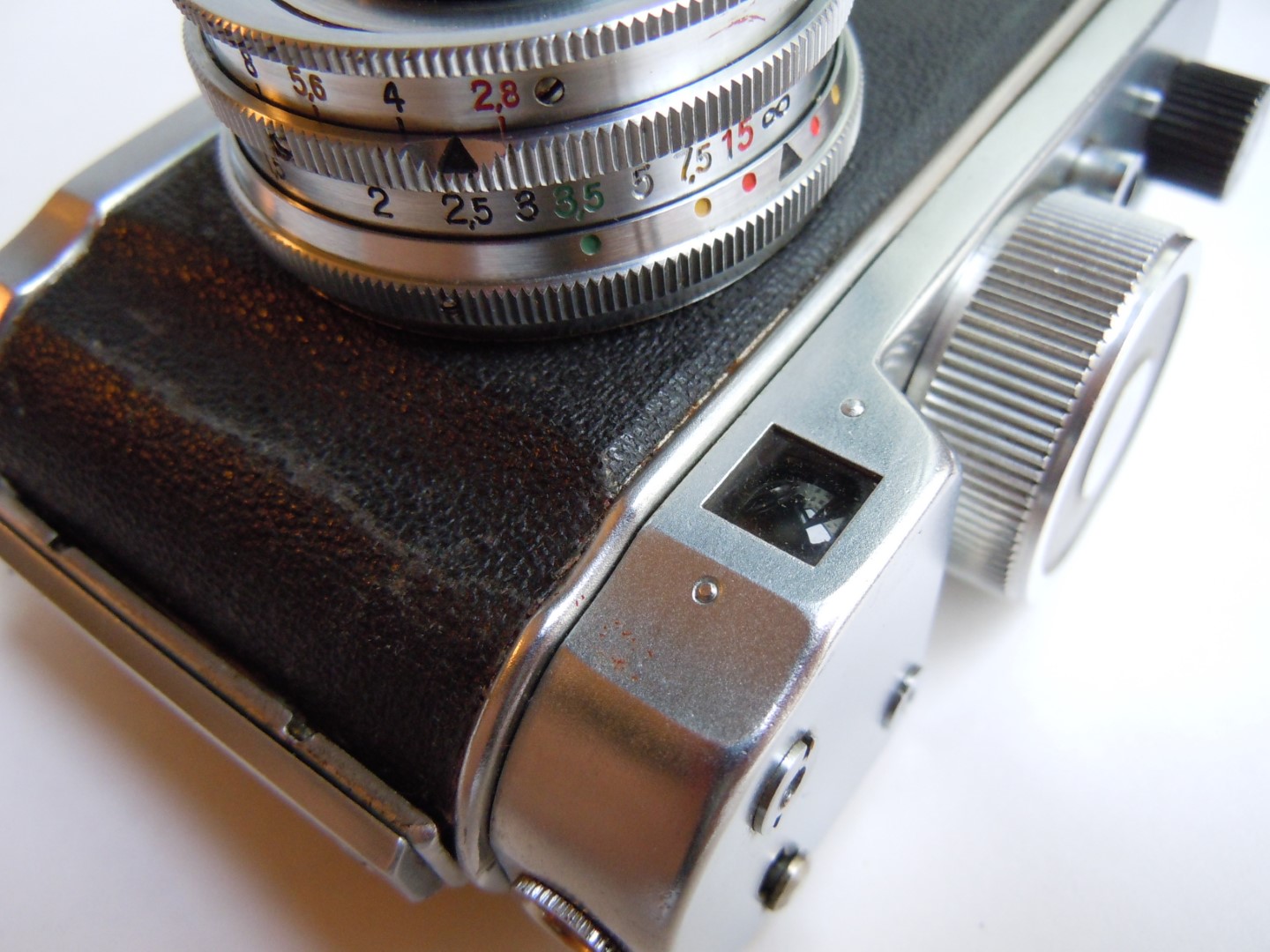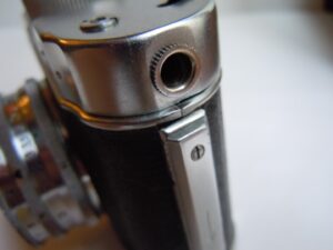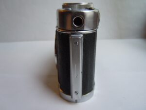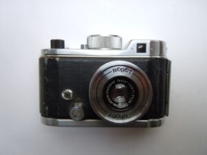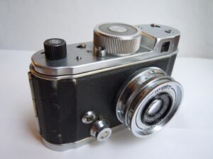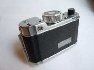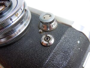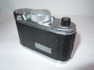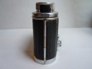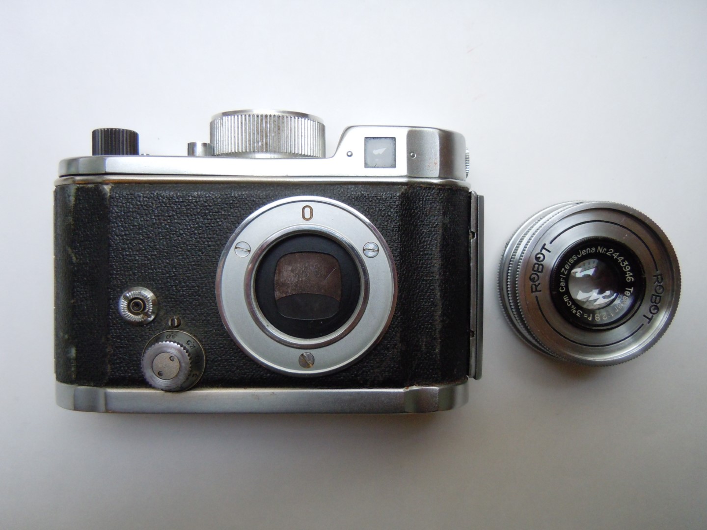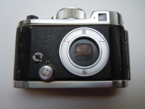 - Objektiv: „Tessar“, f= 3 3/4cm / 1 : 2,8, Carl Zeiss, Jena, Werknummer: 2443946, Material: Buntmetall, verchromt