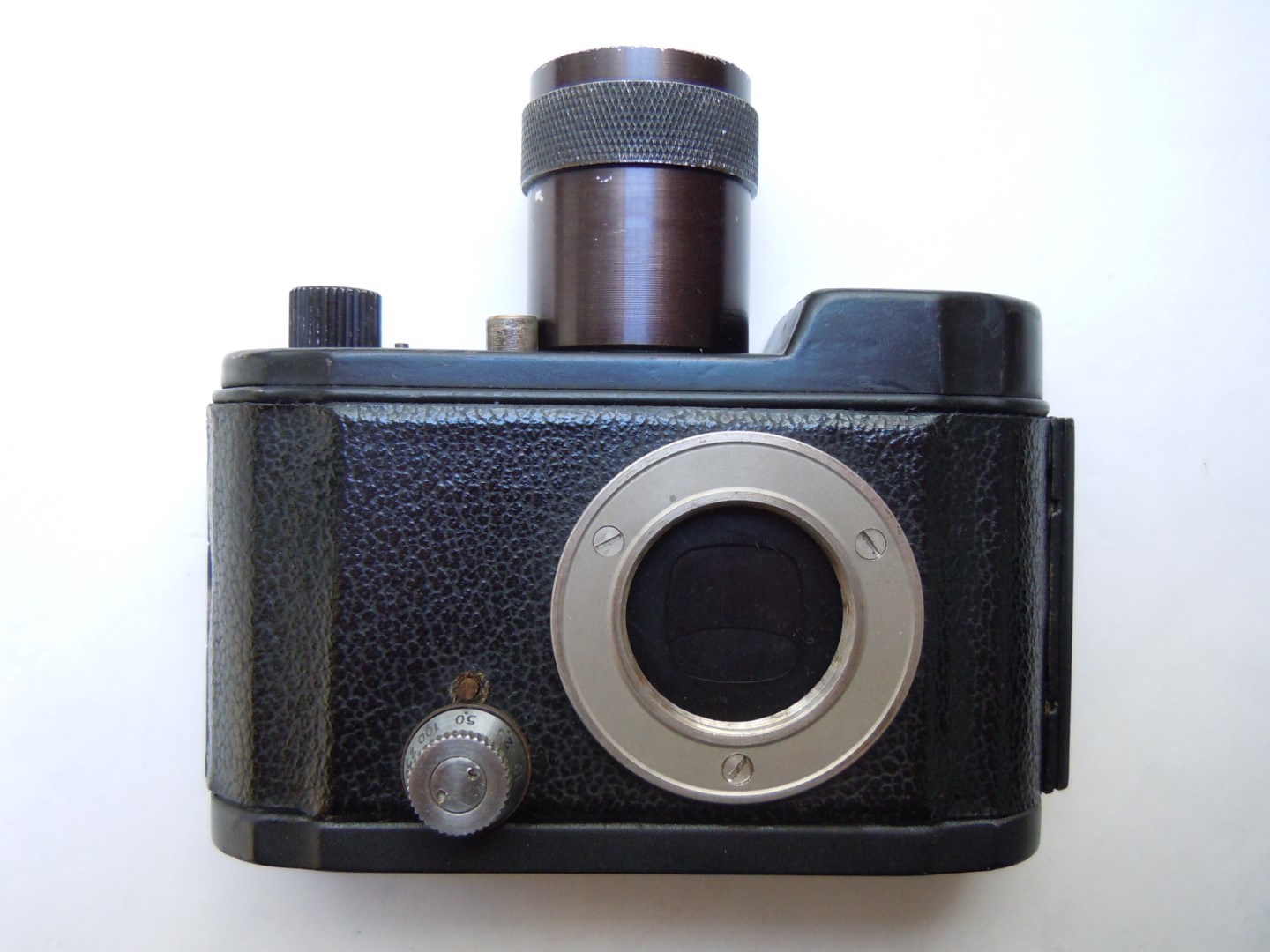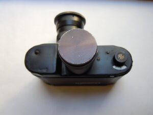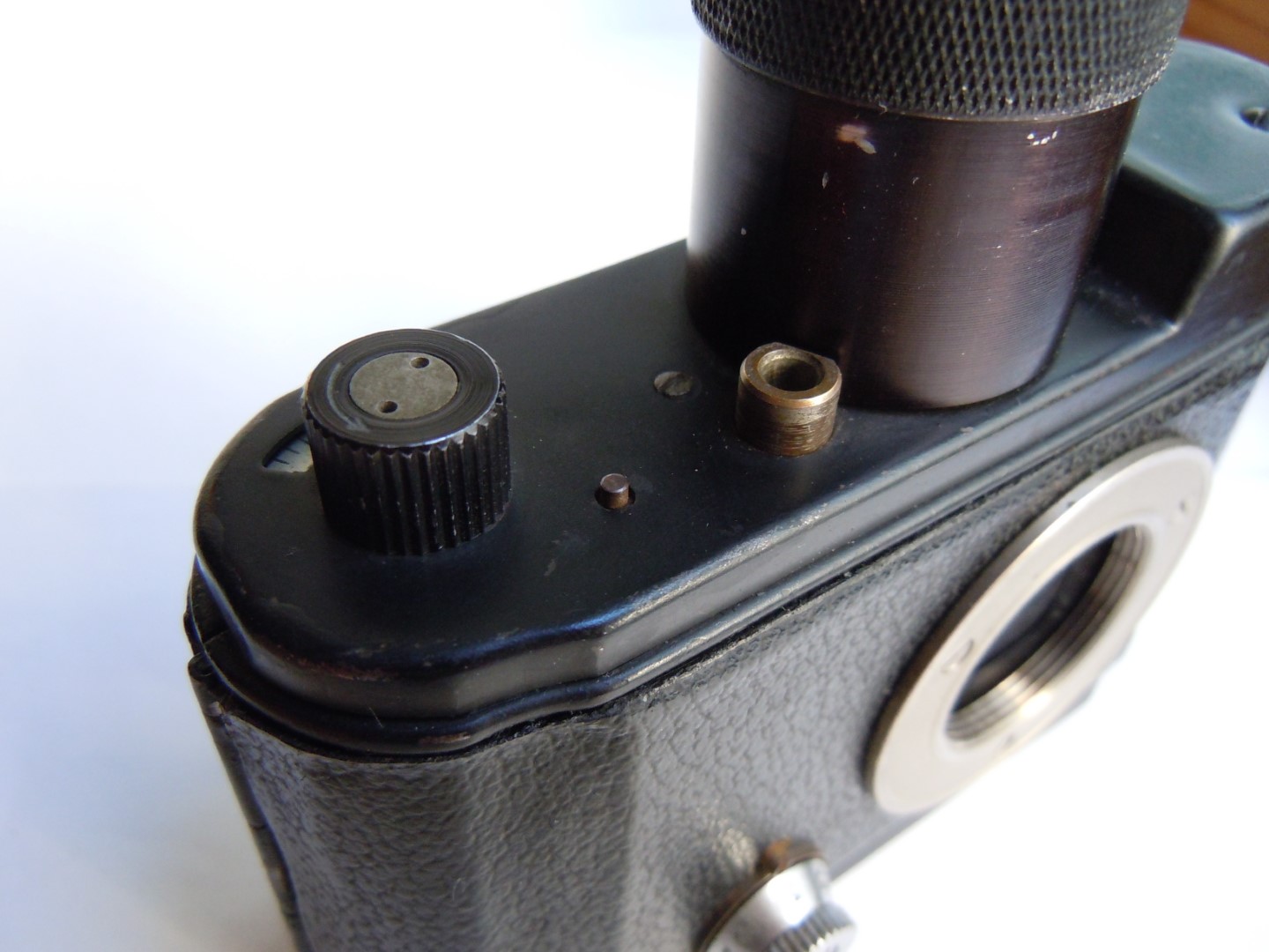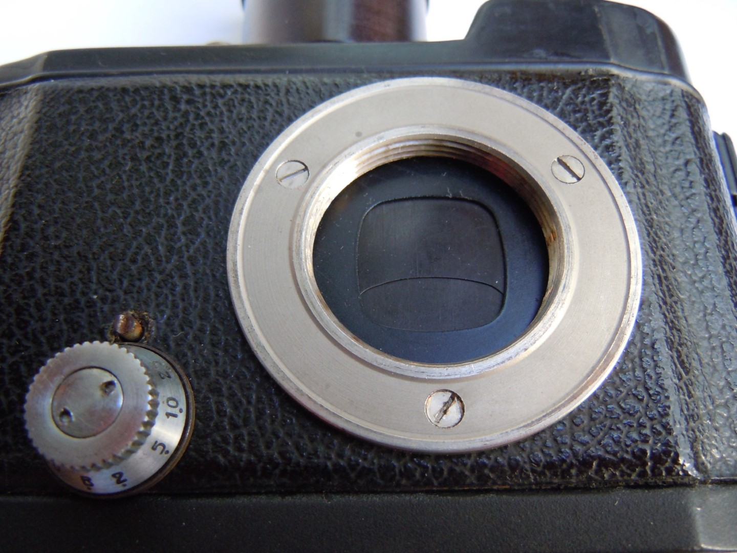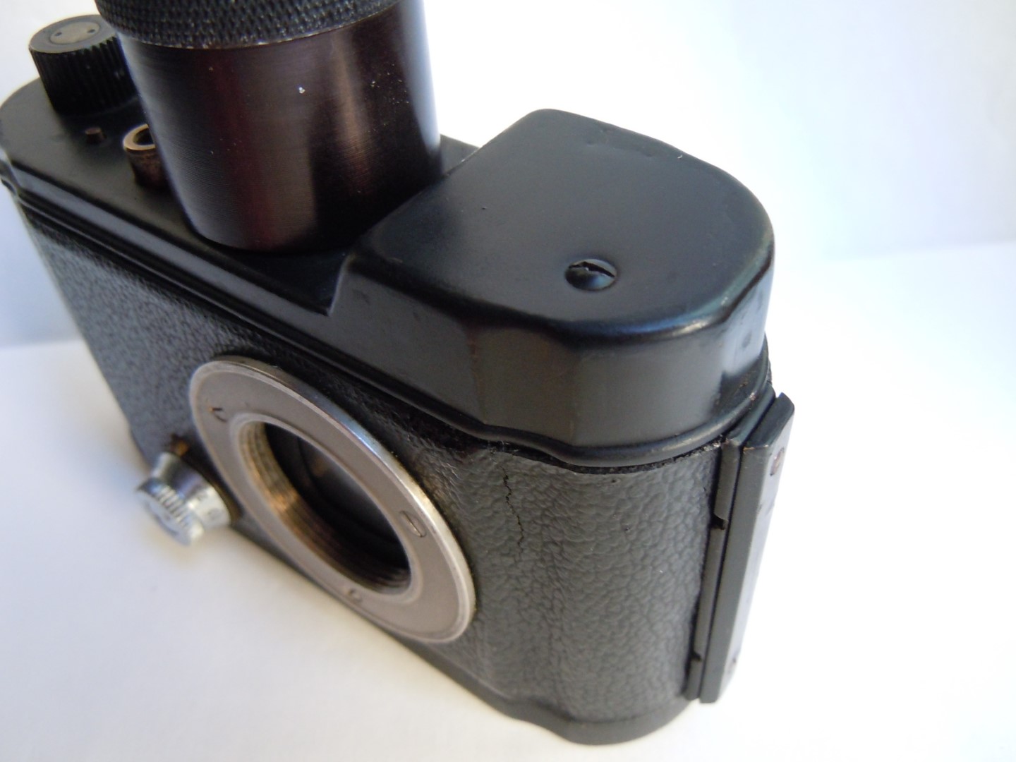 - ohne Sucher, Blitzkontakt, Auslösesperre, Befestigungspunkte der Suchermaske und ohne Befestigungsvorrichtung für Stativ