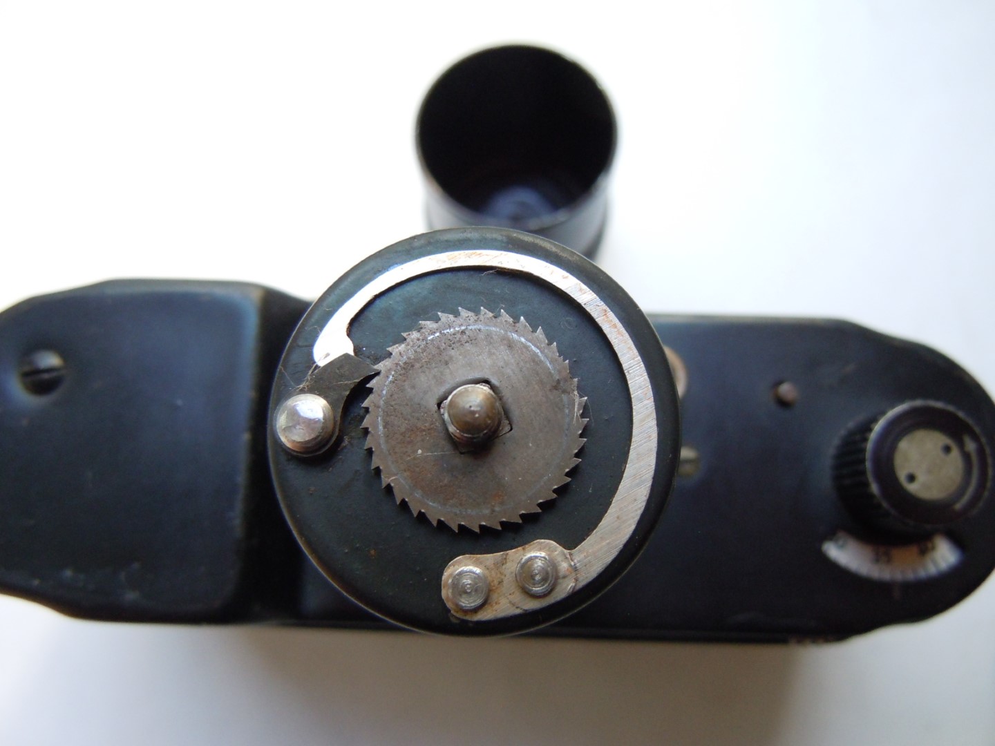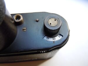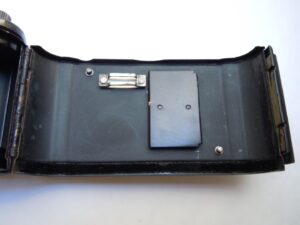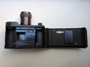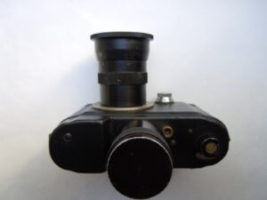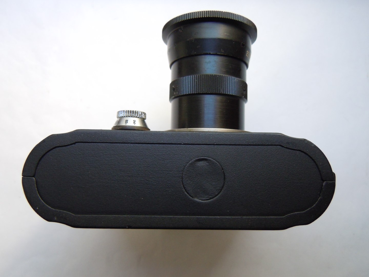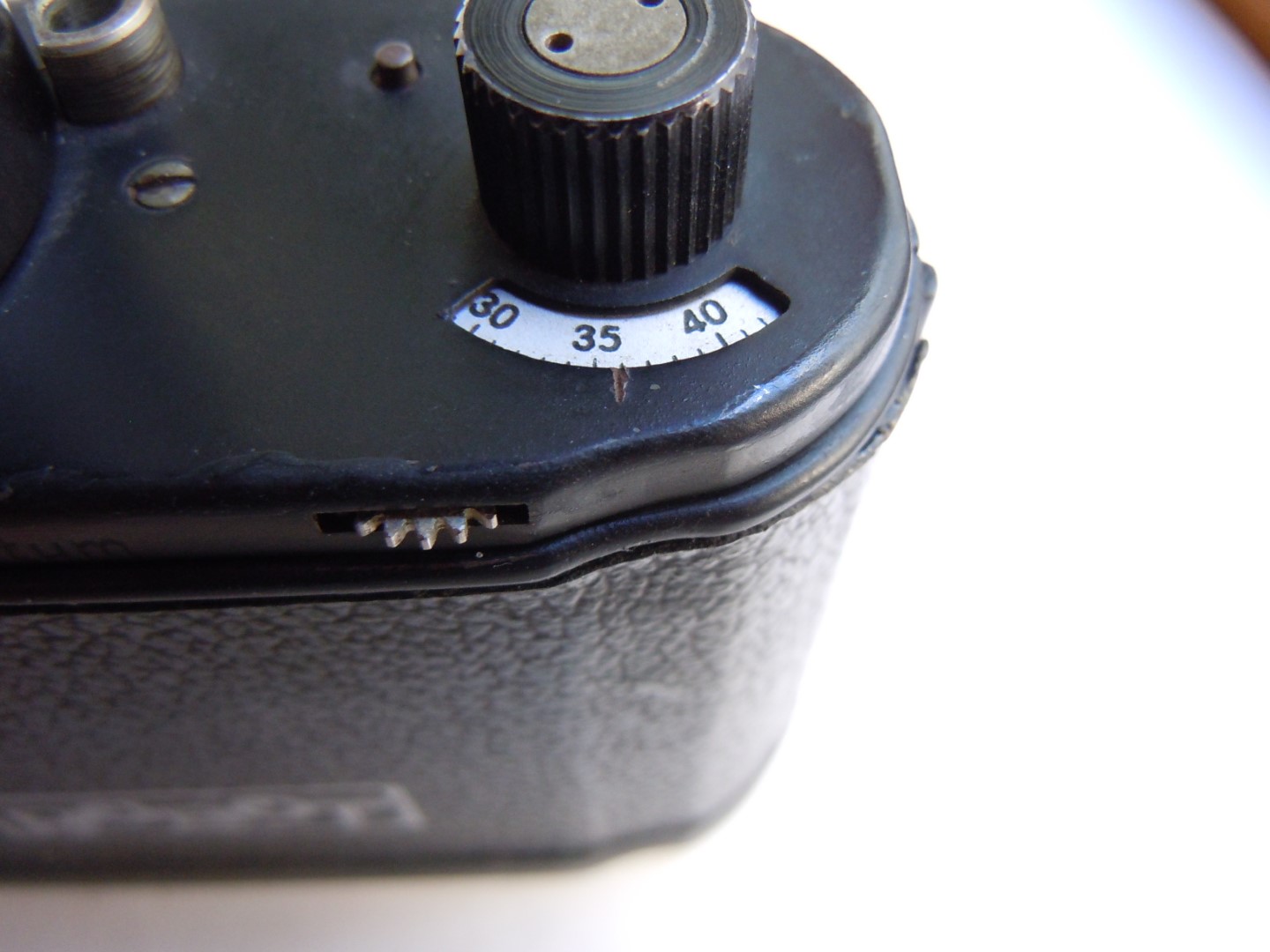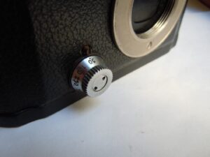 - ohne Sucher, Blitzkontakt, Auslösesperre, Befestigungspunkte der Suchermaske und ohne Befestigungsvorrichtung für Stativ