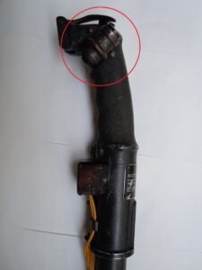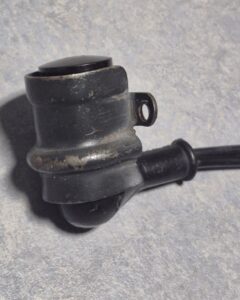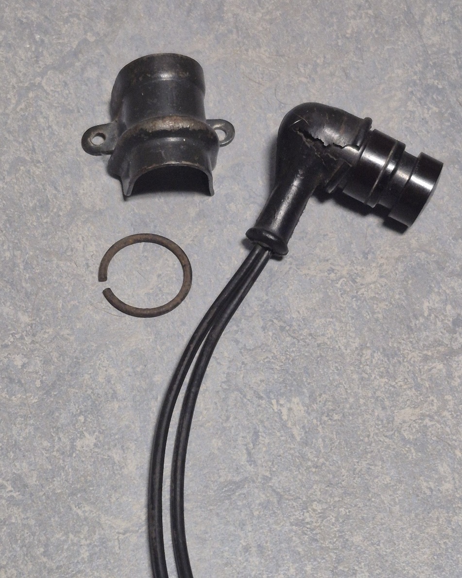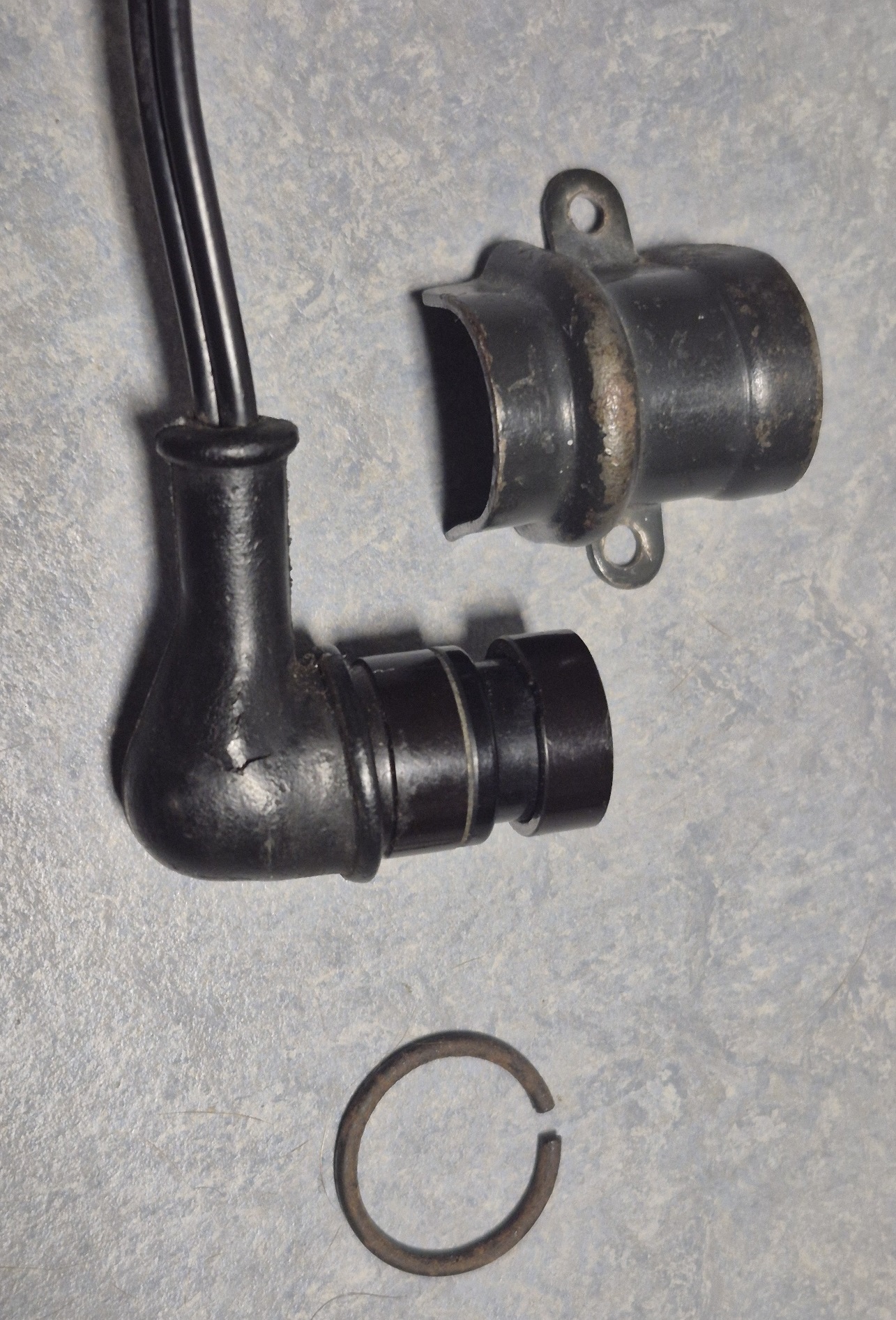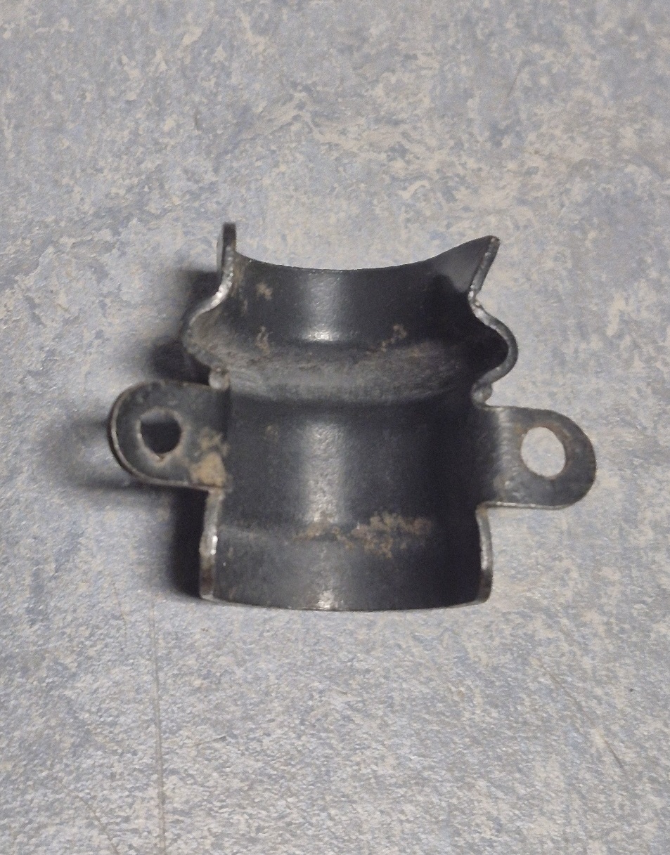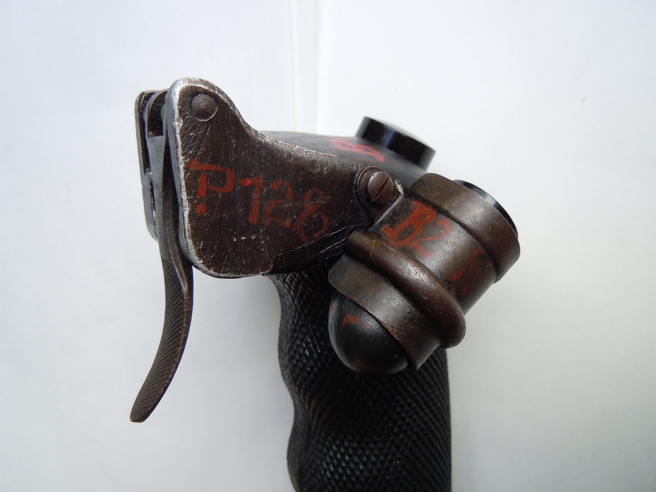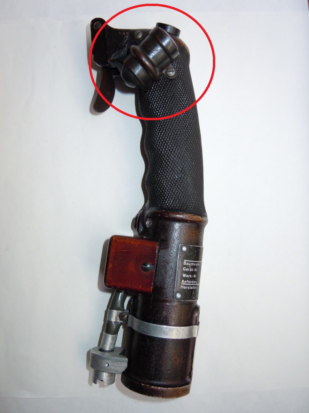 Fl.XXX Schelle für B2-Knopf an Knüppelgriff KG 13 A/B/C, 1944 Bezeichnung: Schelle für B2-Knopf an Knüppelgriff KG 13 A/B/C Anforderungszeichen: Fl.XXX Hersteller: ? Baujahr: ca. 1944 Eingebaut an: Knüppelgriffe KG 13 A/B/C Bemerkung: Schelle für zusätzlichen B2-Knopf, Druckknopf verkabelt mit Gummischutz
