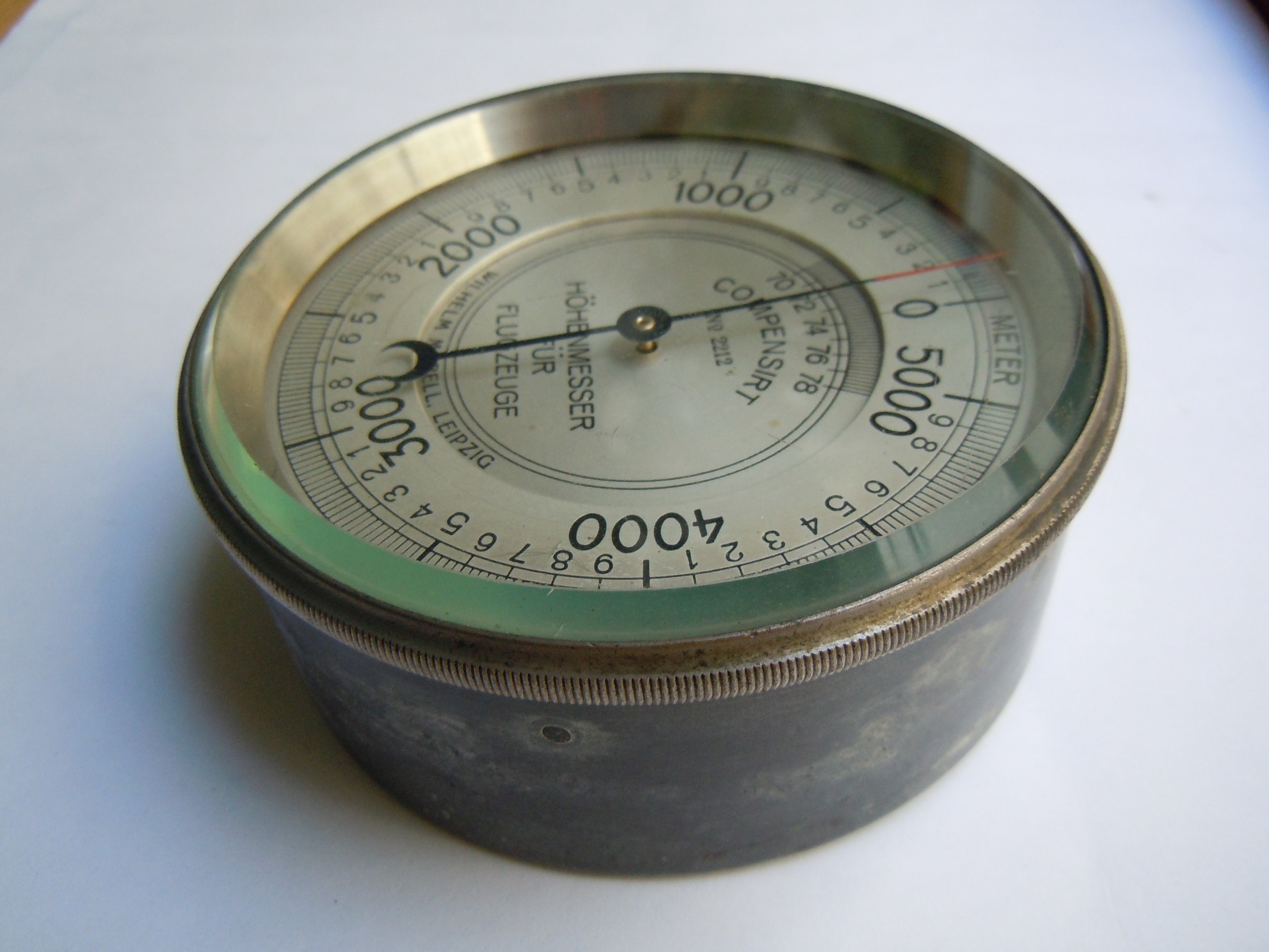 Höhenmesser, W.Morell, 5000m, 1916 Bezeichnung: Flugzeug-Höhenmesser Messbereich: 0 – 5000 m Hersteller: Wilhelm Morell, Leipzig Baujahr: ca. 1916 Werknummer: 2212 Bemerkung: die zugehörige Ledertasche mit Sichtfenster und Aufhängeösen fehlt