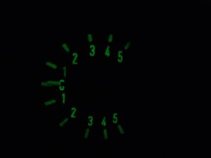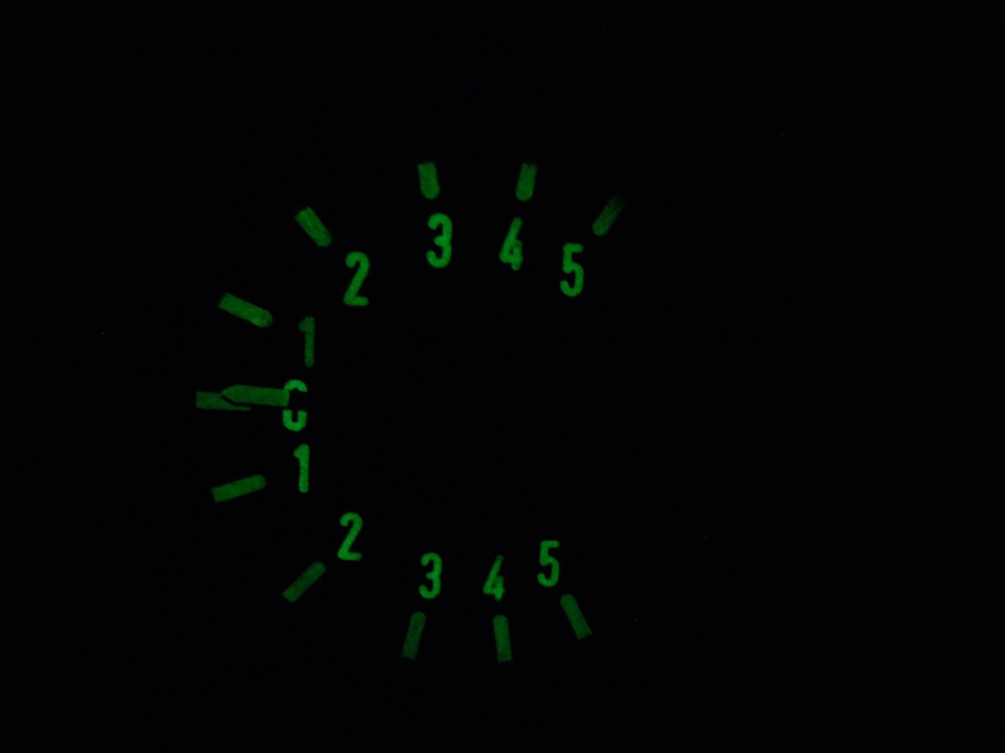 Das Gerät befindet sich in sehr gutem und vermutlich voll funktionstüchtigem Zustand. Das Gehäuse und Ziffernblatt sind sehr gut erhalten, Ziffermblatt und Zeiger mit kompletter Leuchtmasse belegt. Der Zeiger schwingt frei.